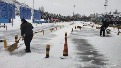 12月13日凌晨至14日连日来的强降雪为整个孤山镇蒙上了皑皑白雪,连续的降雪造成了路面湿滑、道路结冰现象严重,对车辆安全行驶,正常超限检测工作带来了困难。当班工作人员不定时对站区前后路段、静态磅积雪结冰进行清扫,第一时间消除安全隐患,通过及时清扫、抛洒融雪剂等方式清理着道路及场地积雪、积冰,保障道路安全畅通。