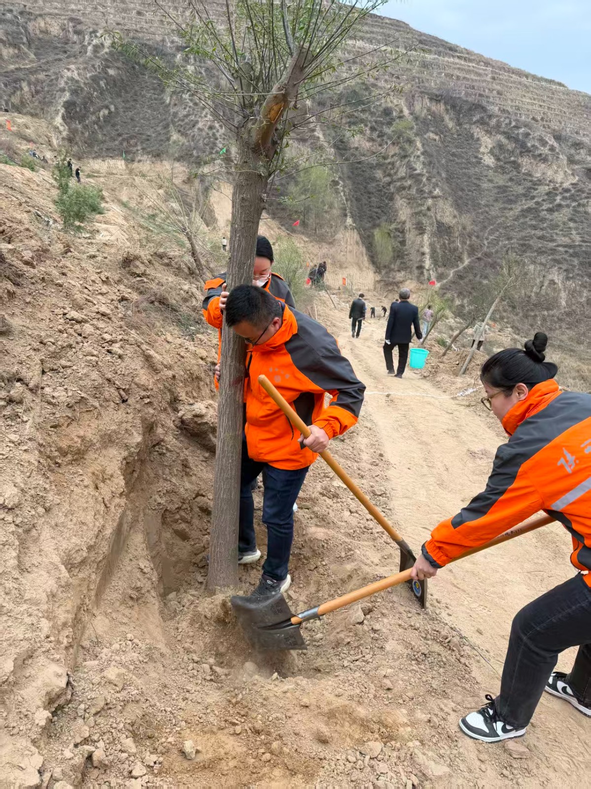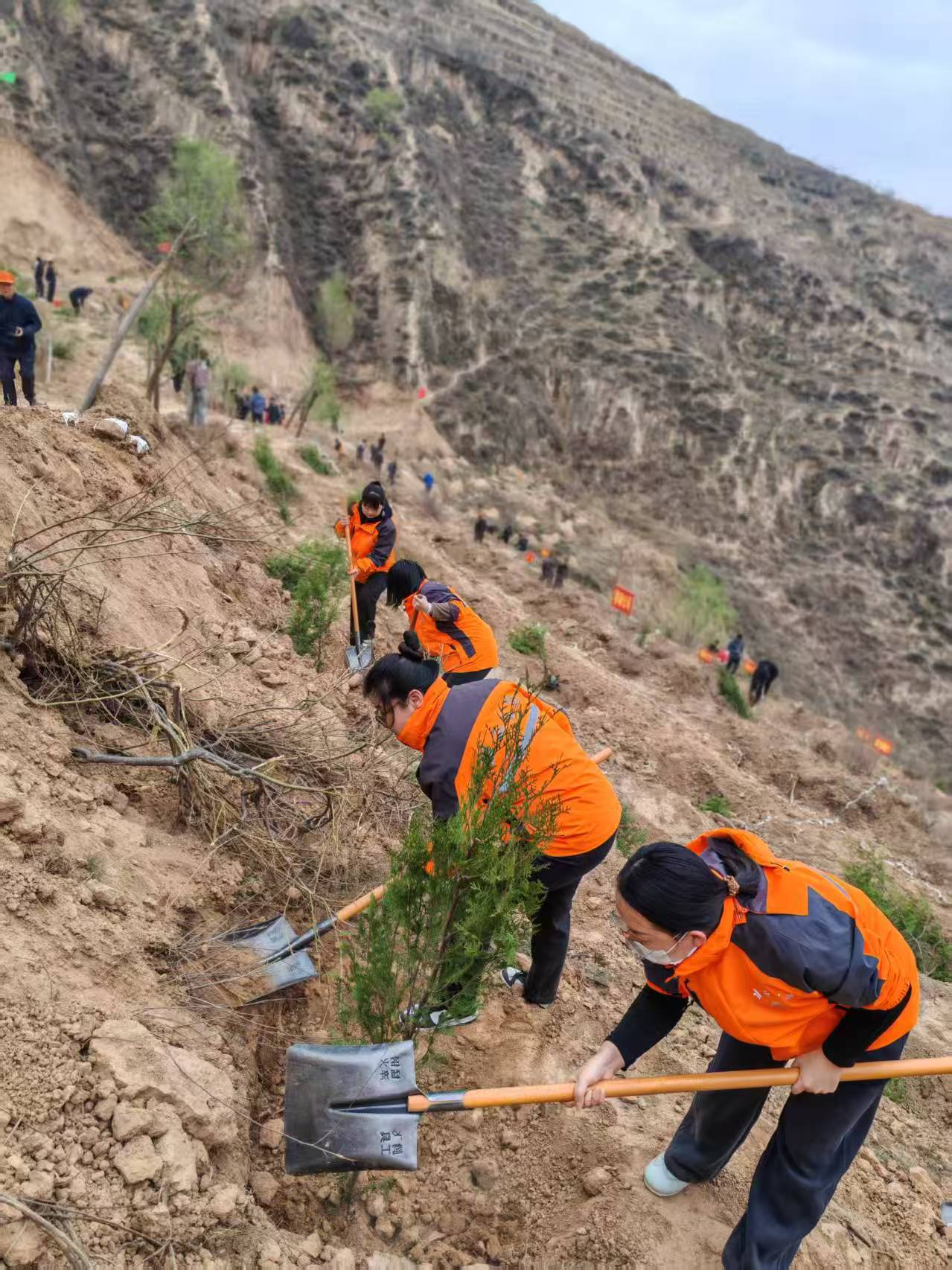 活动现场到处都是忙碌的身影,大家精神饱满、分工协作,在坡地上挥锹铲土、扶苗定根、浇水养护,将一株株苗木稳稳栽入树坑,热情高涨的植树热潮充满了米脂银南新区山头。新栽植的30余棵苗木昂然挺立,焕发出勃勃生机。