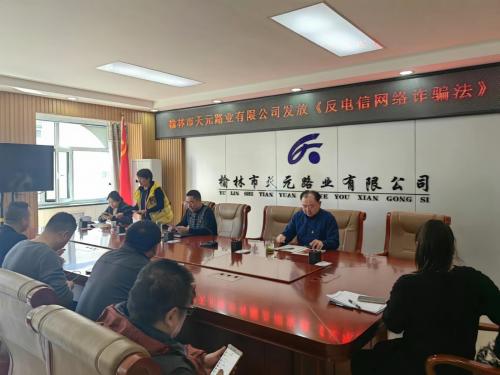 近年来,电信网络诈骗已成为当前发案最高、损失最大、群众反响最强烈的突发犯罪。为营造全面反炸氛围,积极创建“无炸企业”,近日,榆林市天元路业有限公司开展了《反电信网络诈骗法》集中宣传贯彻月活动。